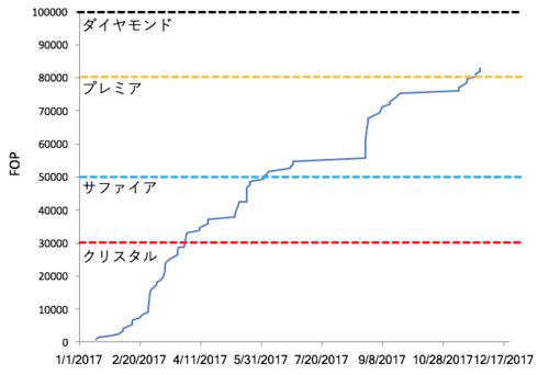 下図は2017年の修行の成果です. 後半の失速(海外出張2つをキャンセル)によりダイヤモンドにはたどり着きませんでしたが,JGCプレミアには達成できました. FOP単価はざっくりですが18JPY/FOPですね.すごい効率悪い.